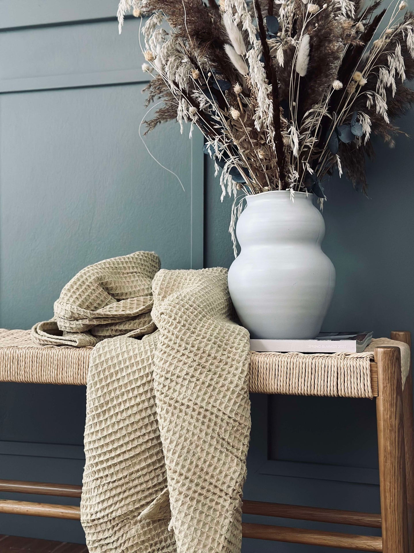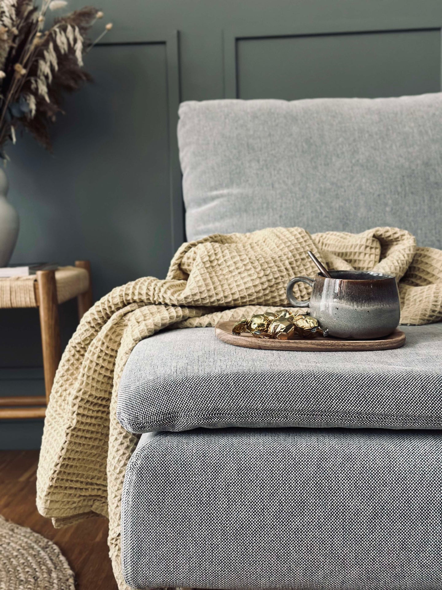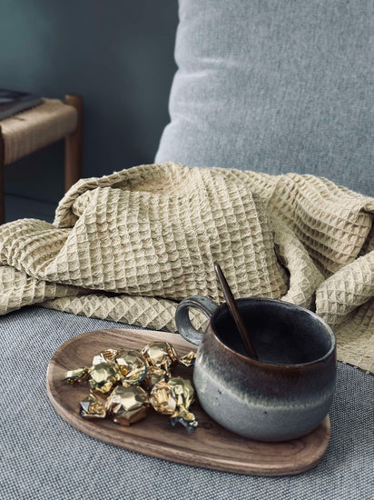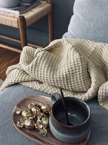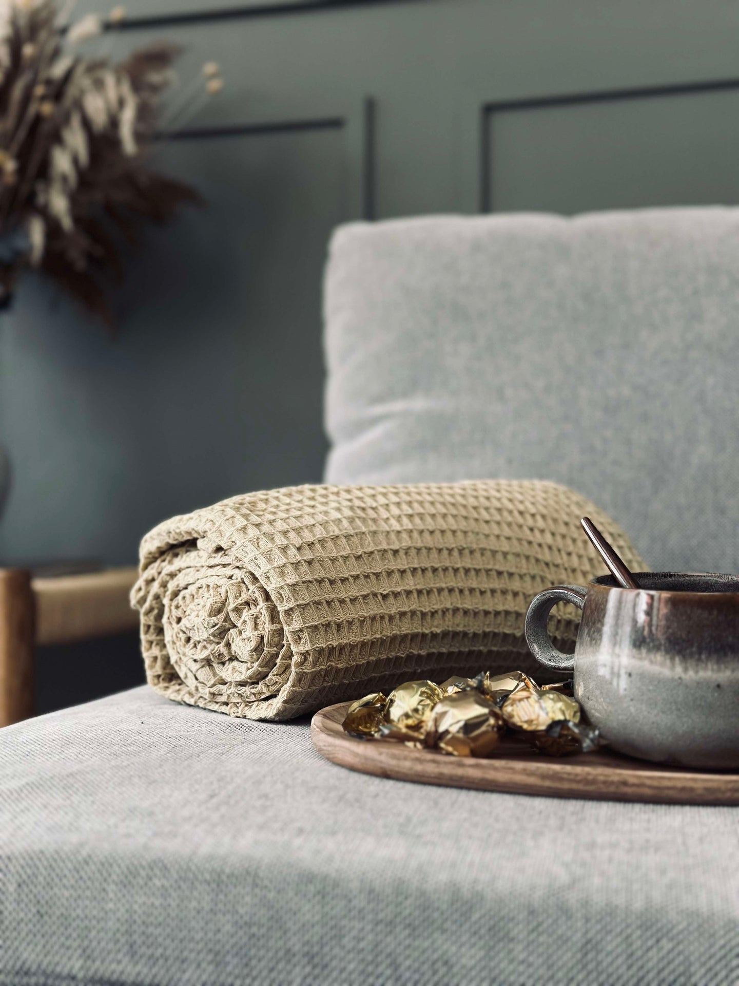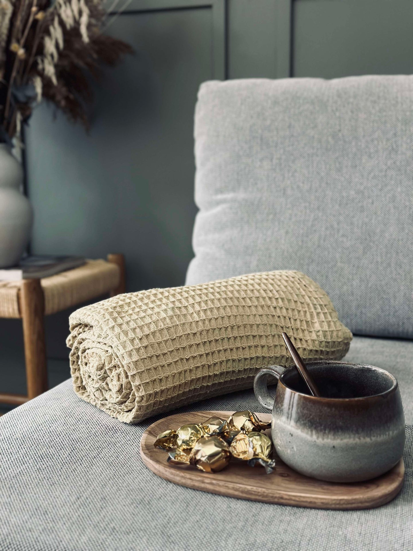 Med en pläd tillverkad av vaflad bomull i färgen akaciegul får du en mjuk och behaglig känsla som bjuder in till avkoppling. Den vaflade strukturen ger filten en särpräglad textur och gör den både lätt och luftig, vilket bidrar till komfort året runt. Den varma akaciegula tonen ger en subtil färgklick som lyfter rummet utan att dominera. Utmärkt för soffan eller sängen, den kombinerar stil och funktionalitet.