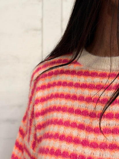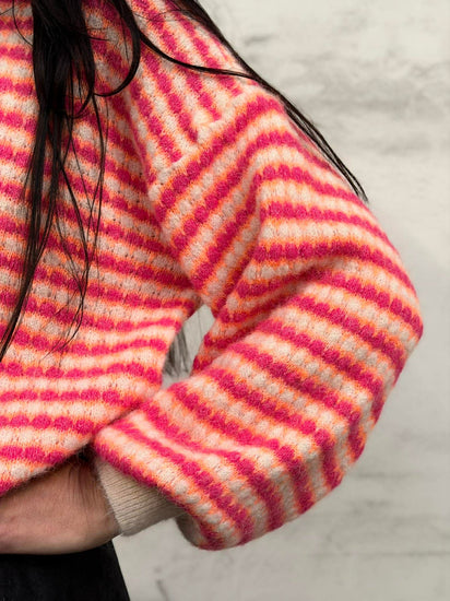 Stickad Regitze är en överdel med fina ränder i en klar rosa ton. Den oversizeda passformen ger ett avslappnat uttryck, vilket gör den lätt att styla i garderoben. Ett bra val när du vill ha en överdel med färg och ett grafiskt mönster som skapar liv i outfiten.