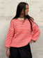 Tröjan är tillverkad i polyester och har ett randigt mönster som ger ett tydligt och modernt uttryck. Den rosa färgen gör överdelen till ett markant inslag, oavsett om du använder den som blickfång eller som kontrast till mer neutrala nyanser.