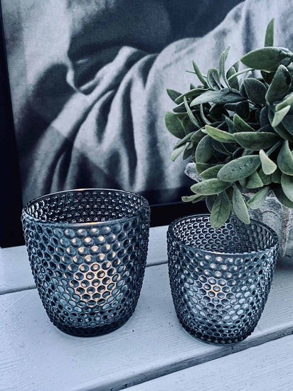 Vår värmeljushållare är gjord av rökfärgat glas med prickar, vilket ger den en unik och stilfull design. Den rökfärgade glasets ton skapar en mysig atmosfär när ljuset tänds. Prickarna i glaset ger ett vackert ljusspel som bidrar till en avkopplande och hemtrevlig känsla. En värmeljushållare som inte bara värmer, utan också förskönar ditt hem.