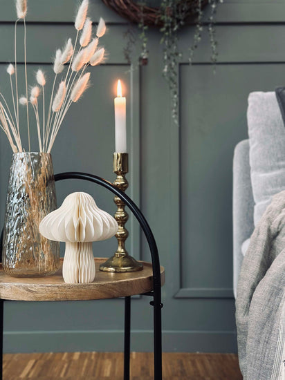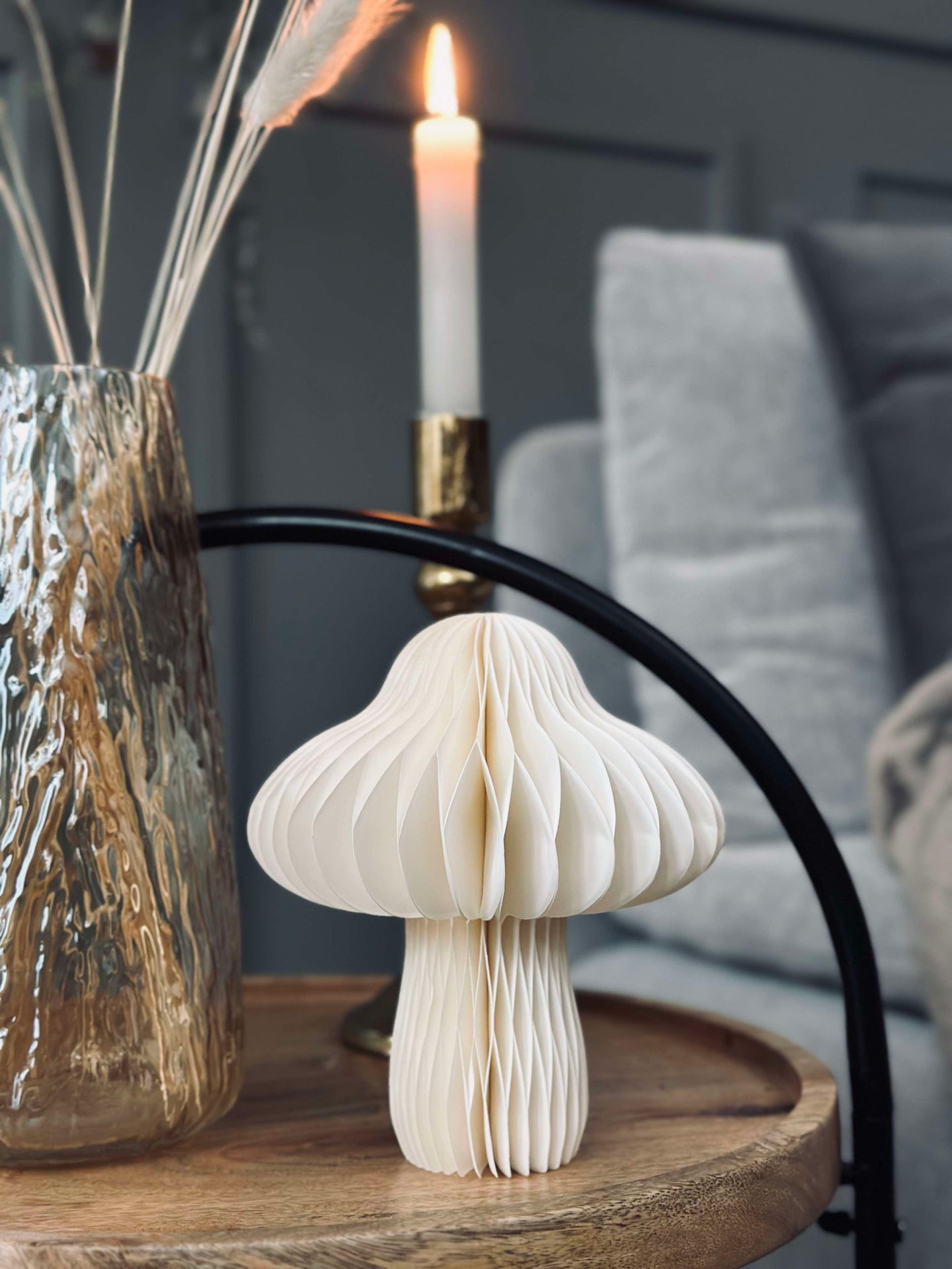 Svamplampan är tillverkad av papper, vilket ger den en lätt och luftig känsla som enkelt kan integreras i olika inredningsstilar. Papperets naturliga egenskaper bidrar till en mjuk belysning som skapar en behaglig atmosfär i rummet. Dessutom är pappersmaterialet ett mer hållbart alternativ, vilket gör Svamplampan till ett miljövänligt val för dem som vill minska sin miljöpåverkan.