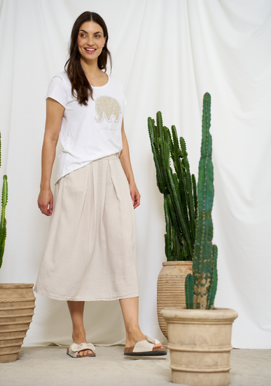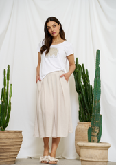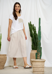T-shirten med tryck från Marta är tillverkad av 100 % bomull, vilket ger en mjuk och behaglig känsla mot huden. Bomullens naturliga andningsförmåga bidrar till en sval och skön upplevelse, oavsett om du bär den under en varm dag eller som ett lager under kyligare förhållanden. Materialets hållbarhet säkerställer att t-shirten behåller sin form och färg över tid.