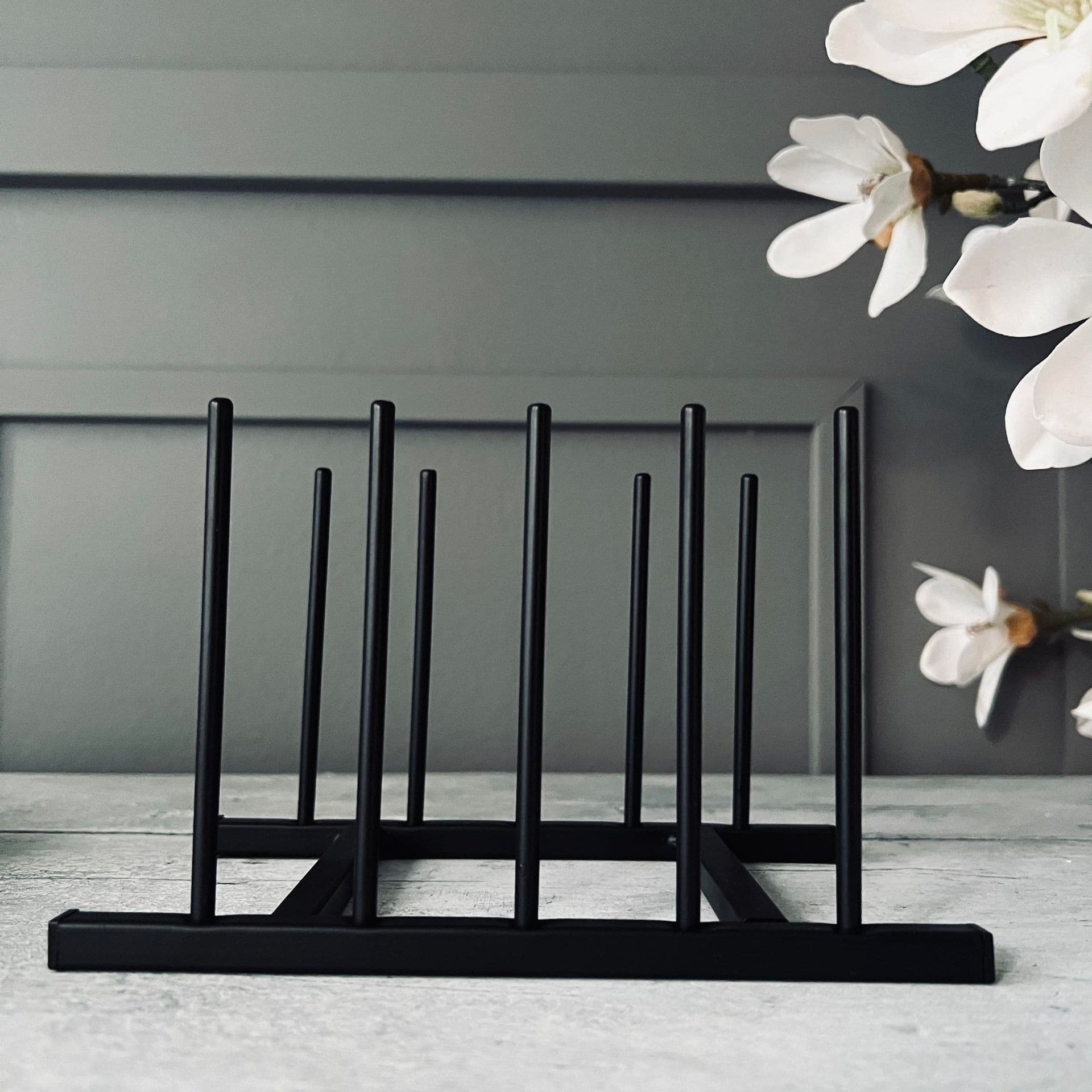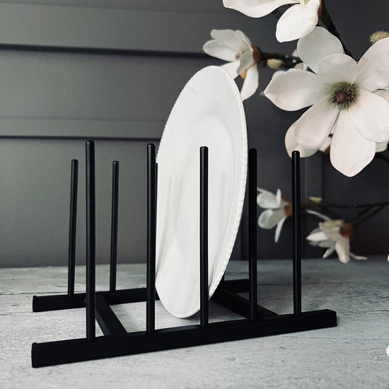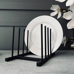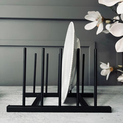 Vårt tallerkenstativ är tillverkat av smart svart metall, vilket ger det en robust och hållbar kvalitet. Metallen är inte bara stark, men också lätt att rengöra, vilket gör det idealiskt för köksmiljöer. Detta ger dig en pålitlig och praktisk lagringslösning för dina tallrikar, samtidigt som det ger ett elegant inslag till din köksinredning.
