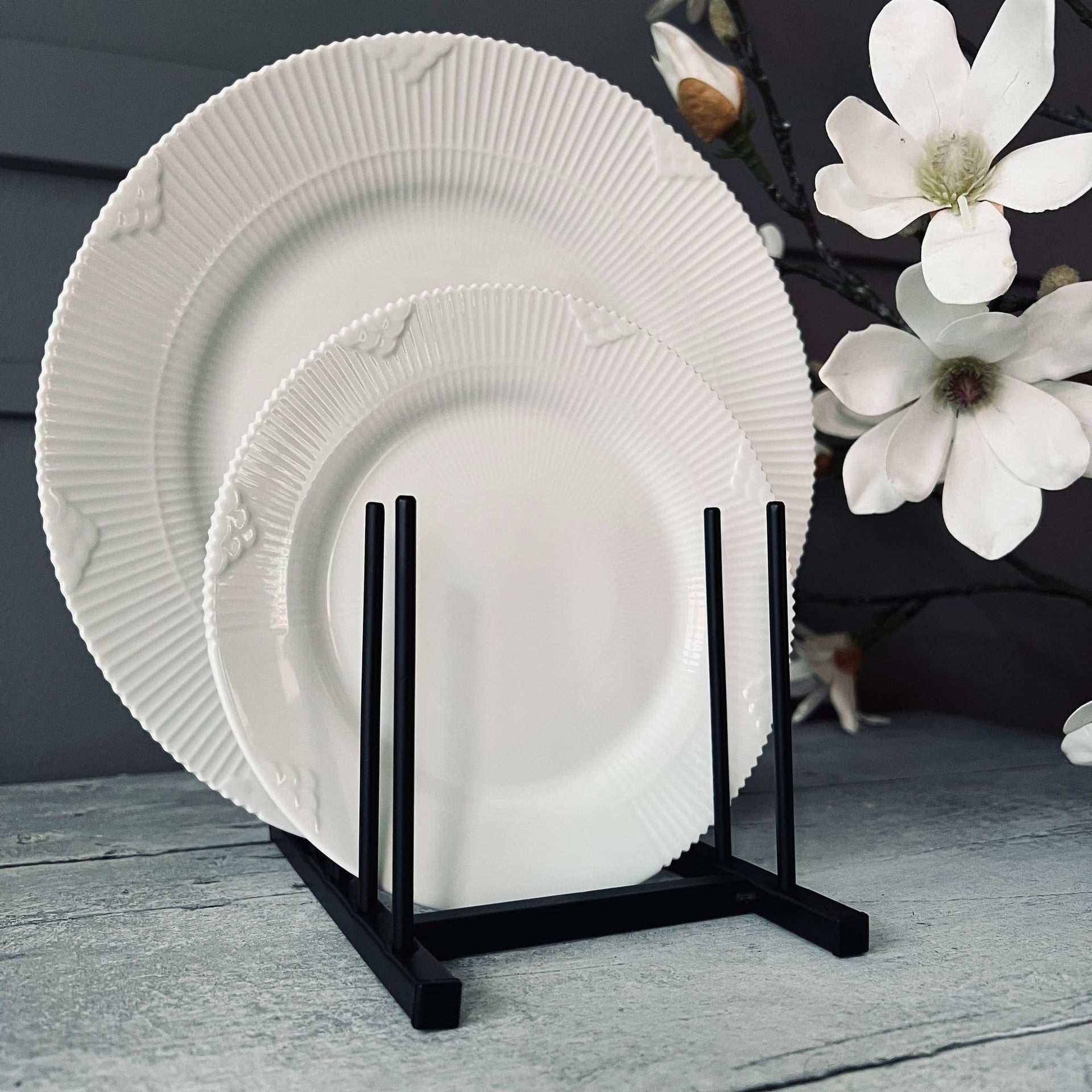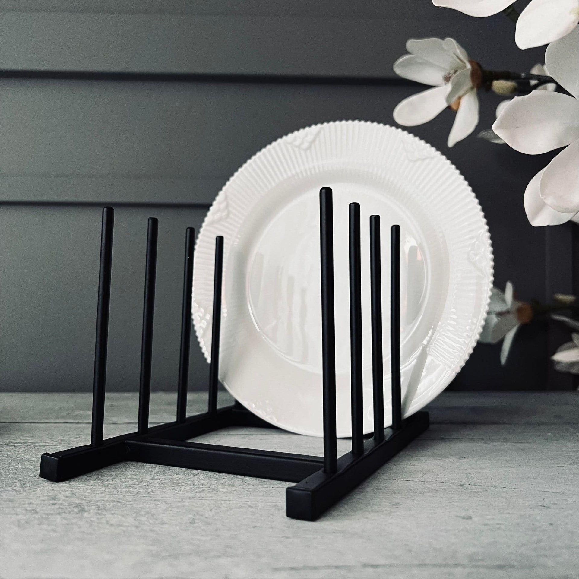 Är du trött på att dina vackra tallrikar gömmer sig bortglömda i skåpet? Här har du en elegant och praktisk lösning. Med vår tallrikshållare i svart metall kan du enkelt och stilfullt visa upp dina favorittallrikar och samtidigt hålla ordning i köket.