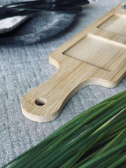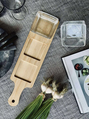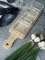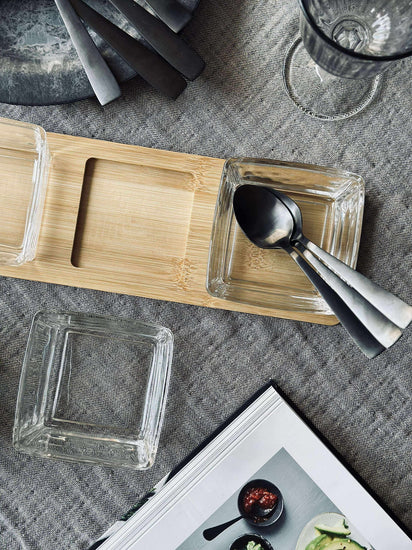 - Sättet inkluderar 4 glas-skålar och ett serveringsfat i bambu