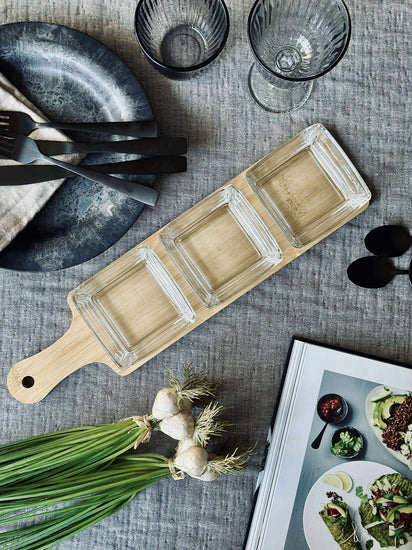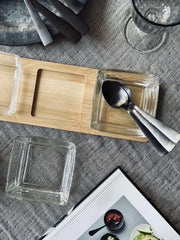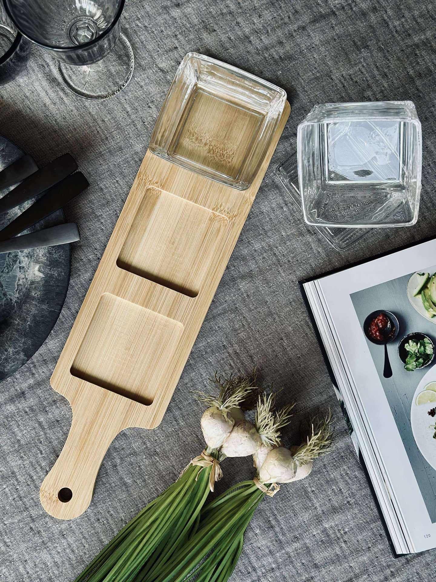 Detta tapas-set erbjuder ett harmoniskt sätt att servera och njuta av små rätter. De fyra glas-skålarna ger möjlighet att presentera olika smaker och texturer samtidigt, medan serveringsfatet i bambu tillför en naturlig och varm känsla till dukningen. Materialvalen gör det enkelt att rengöra och underhålla, vilket ger en praktisk lösning för både vardagsbruk och speciella tillfällen.