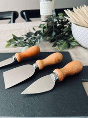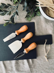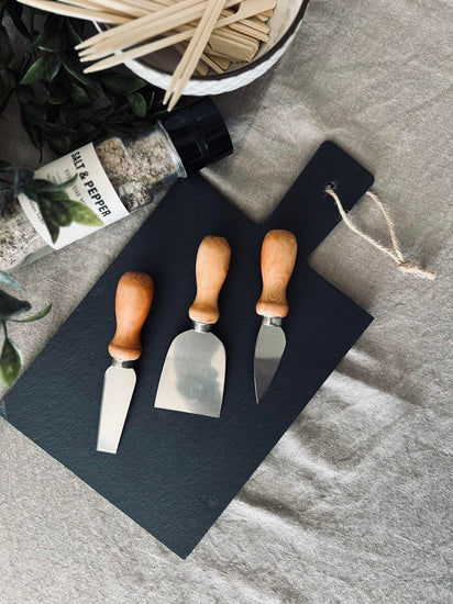Vill du servera ostar på ett stilfullt och praktiskt sätt vid nästa tillställning? Då är detta tapas-set med tre knivar och en skifferbräda en utmärkt lösning. Det ger en sofistikerad touch till din servering.