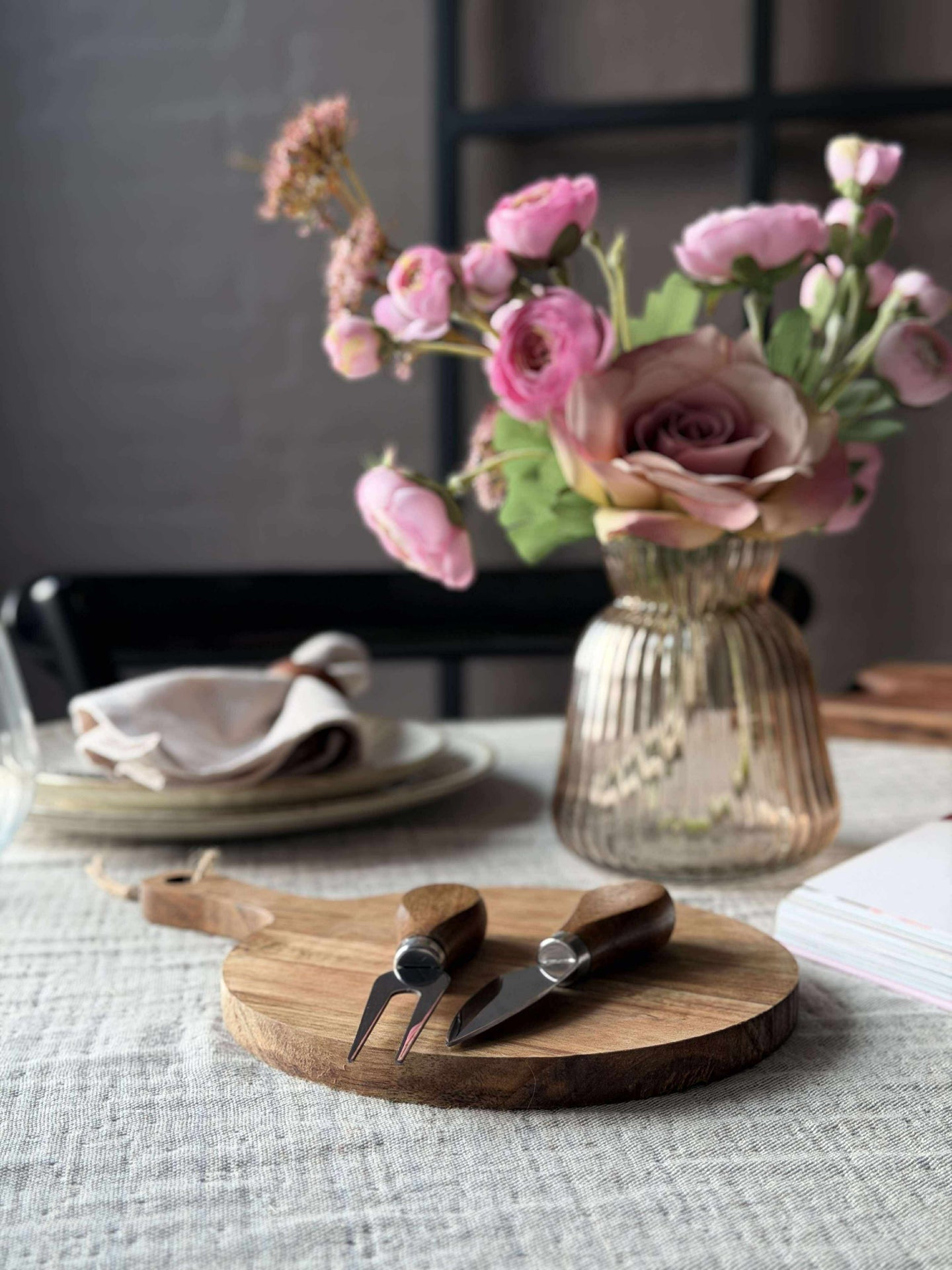 Den runda formen och den naturfärgade ytan gör setet enkelt att styla tillsammans med både klassisk och modern servis.