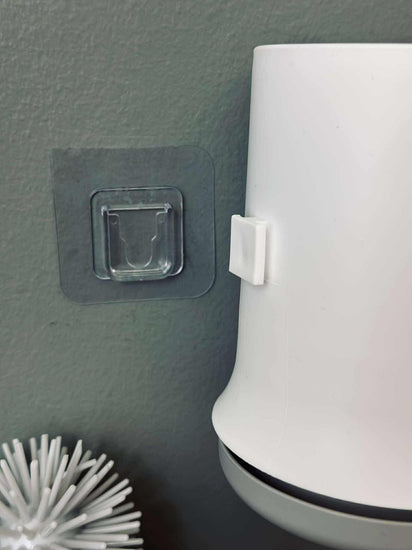 - Toalettborsten levereras med en väggmonterad hållare med självhäftande klistermärke