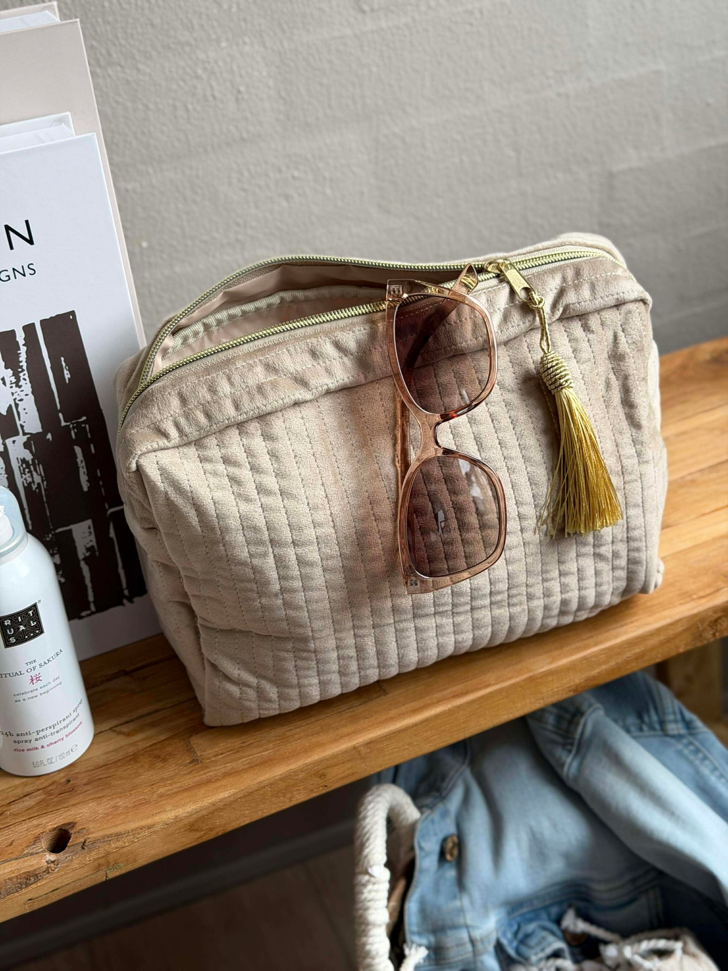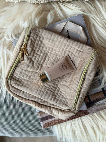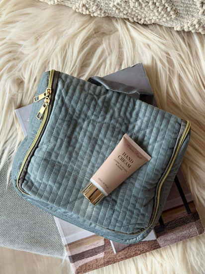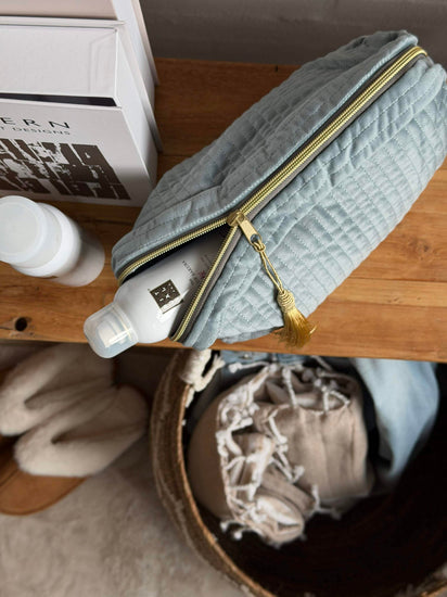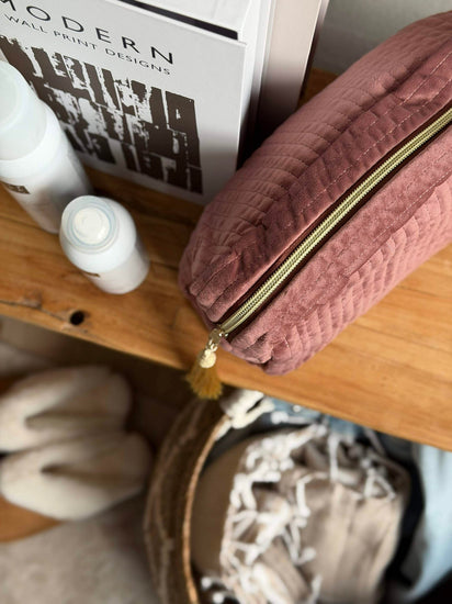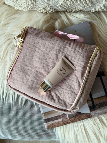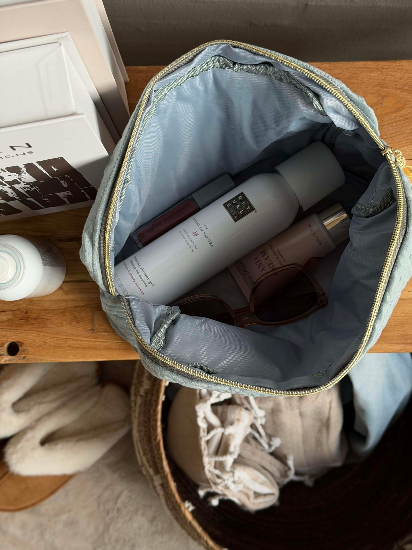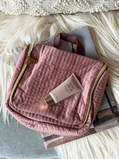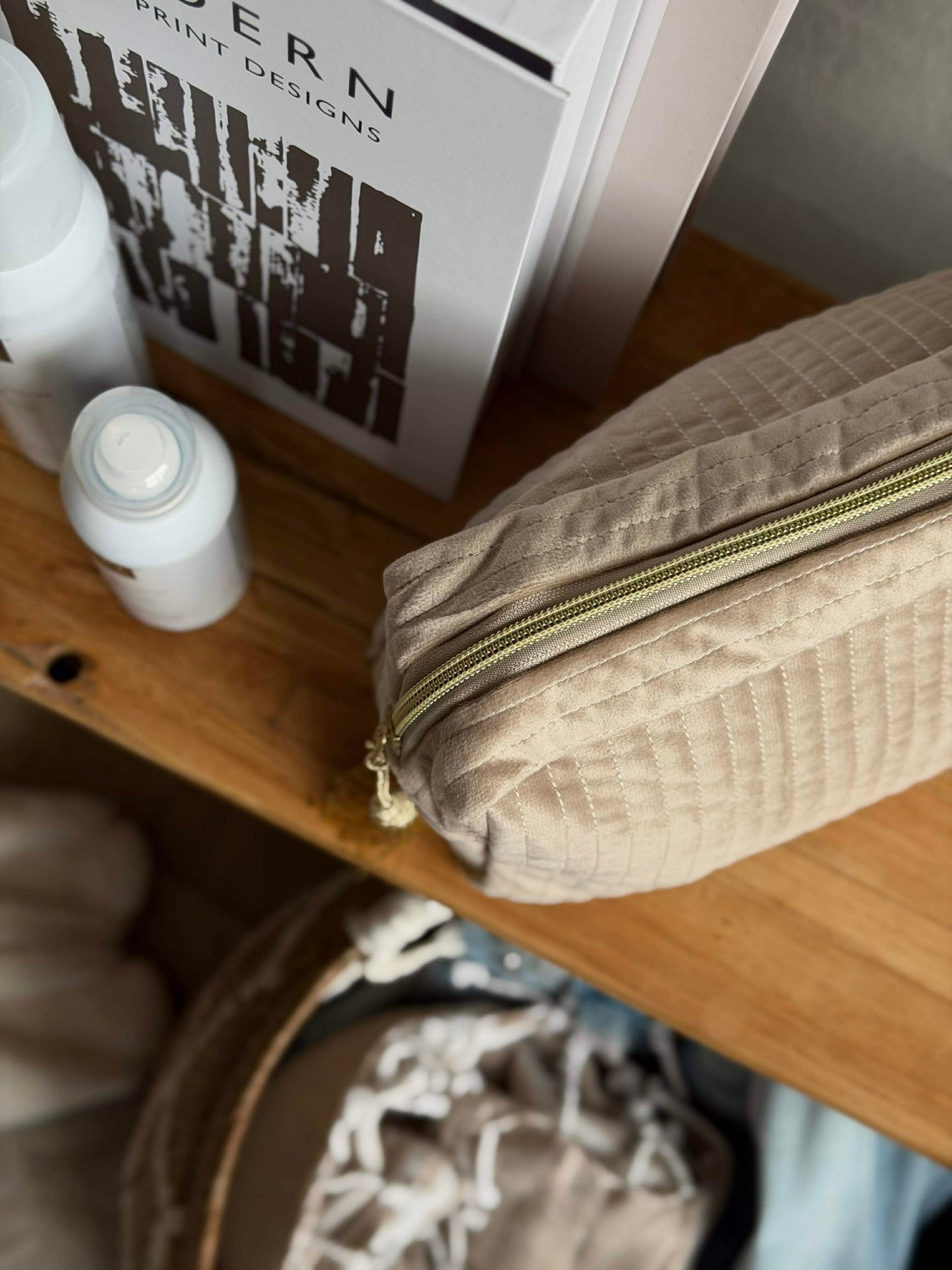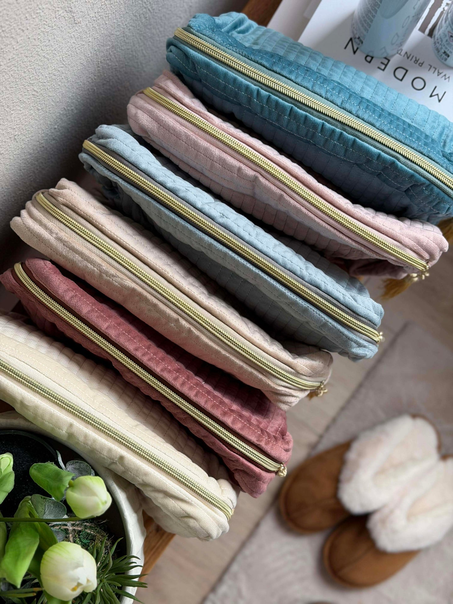 Toalettväskan är gjord i babyvelour, vilket ger en mjuk yta och ett lugnt, mysigt utseende.