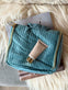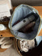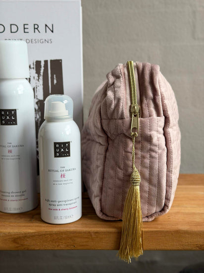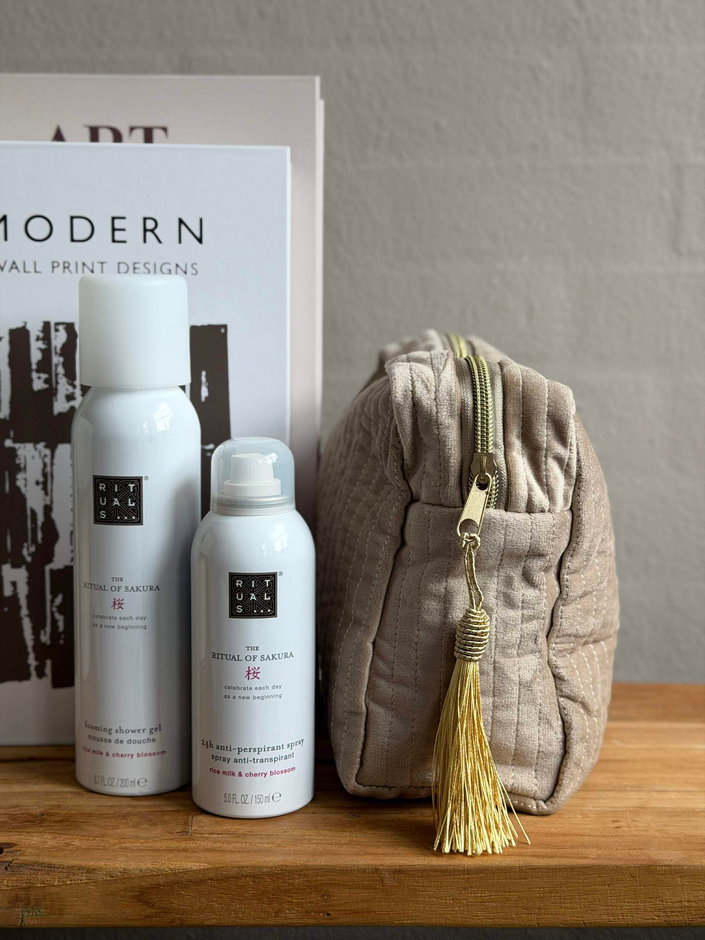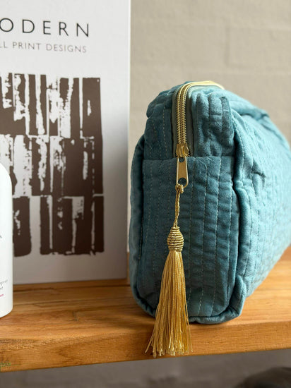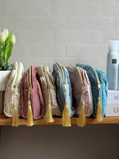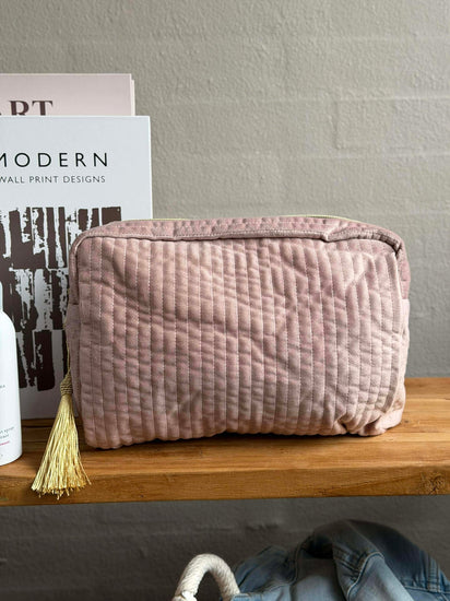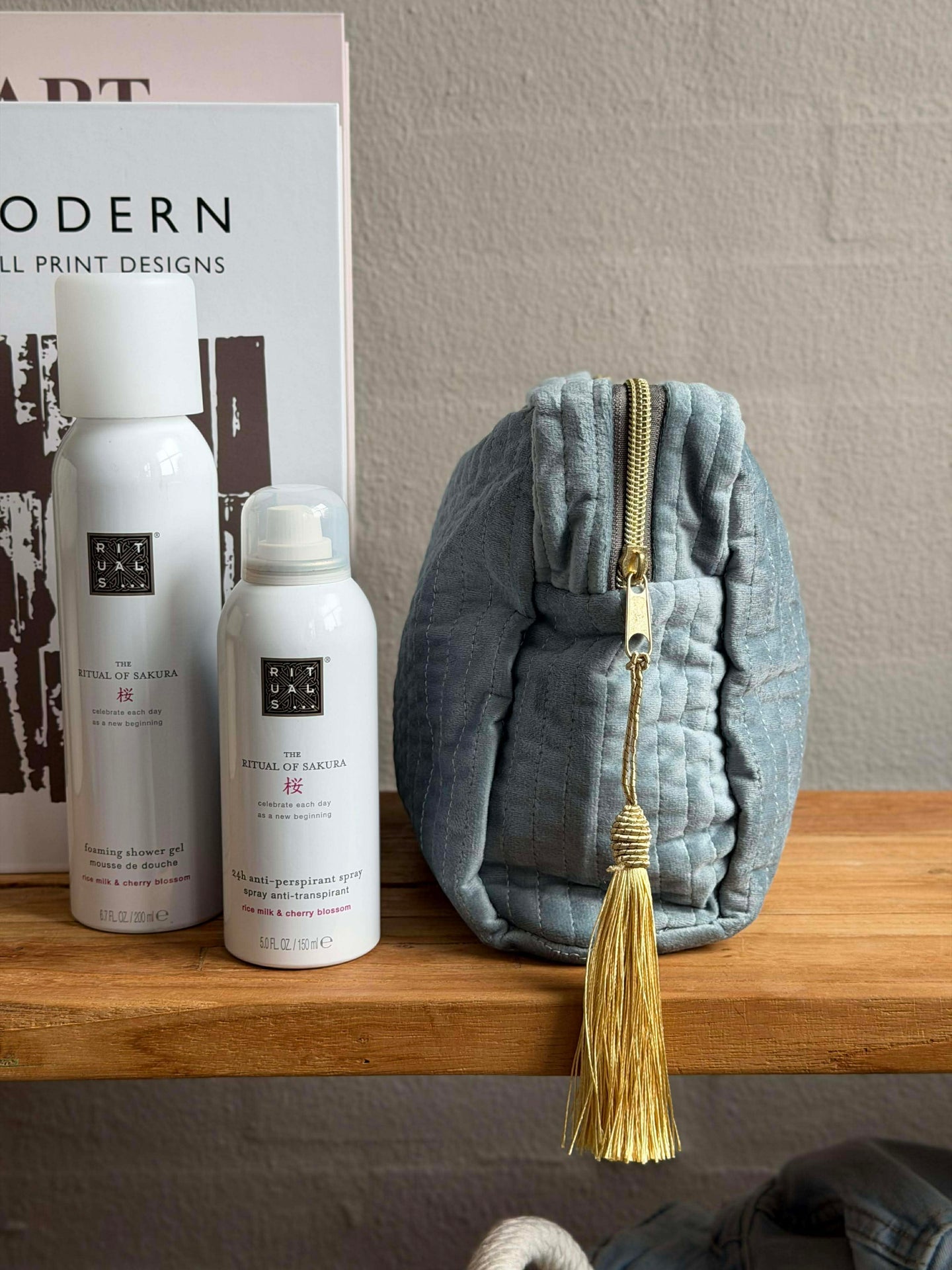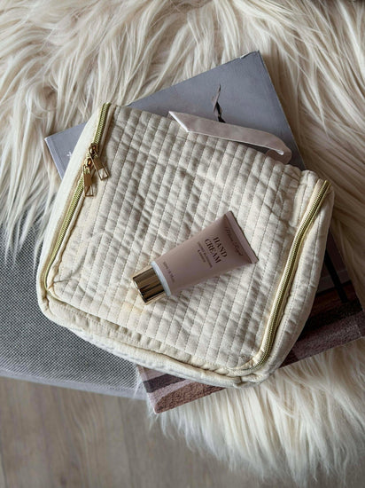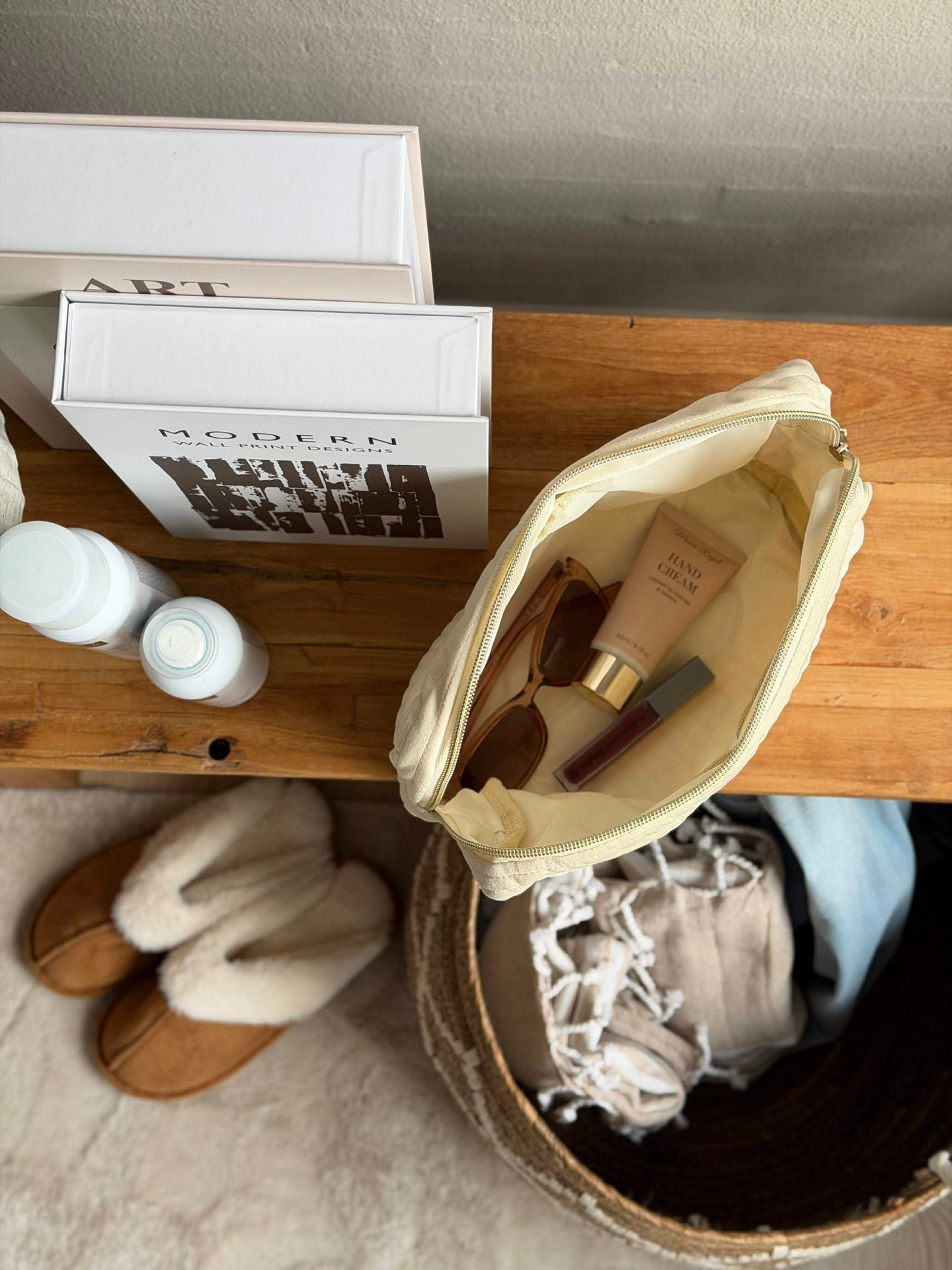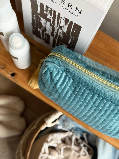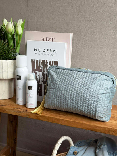 Toalettväskan är gjord i babyvelour, vilket ger en mjuk yta och ett lugnt, mysigt utseende.