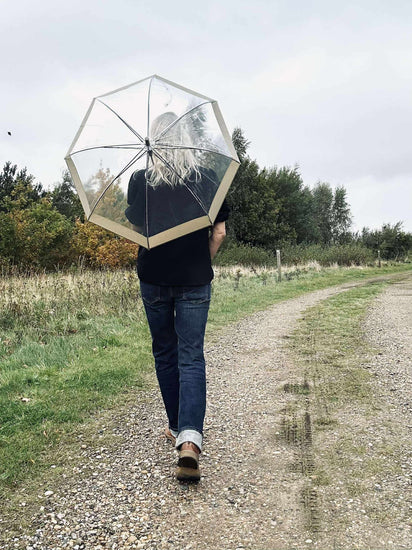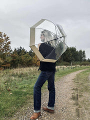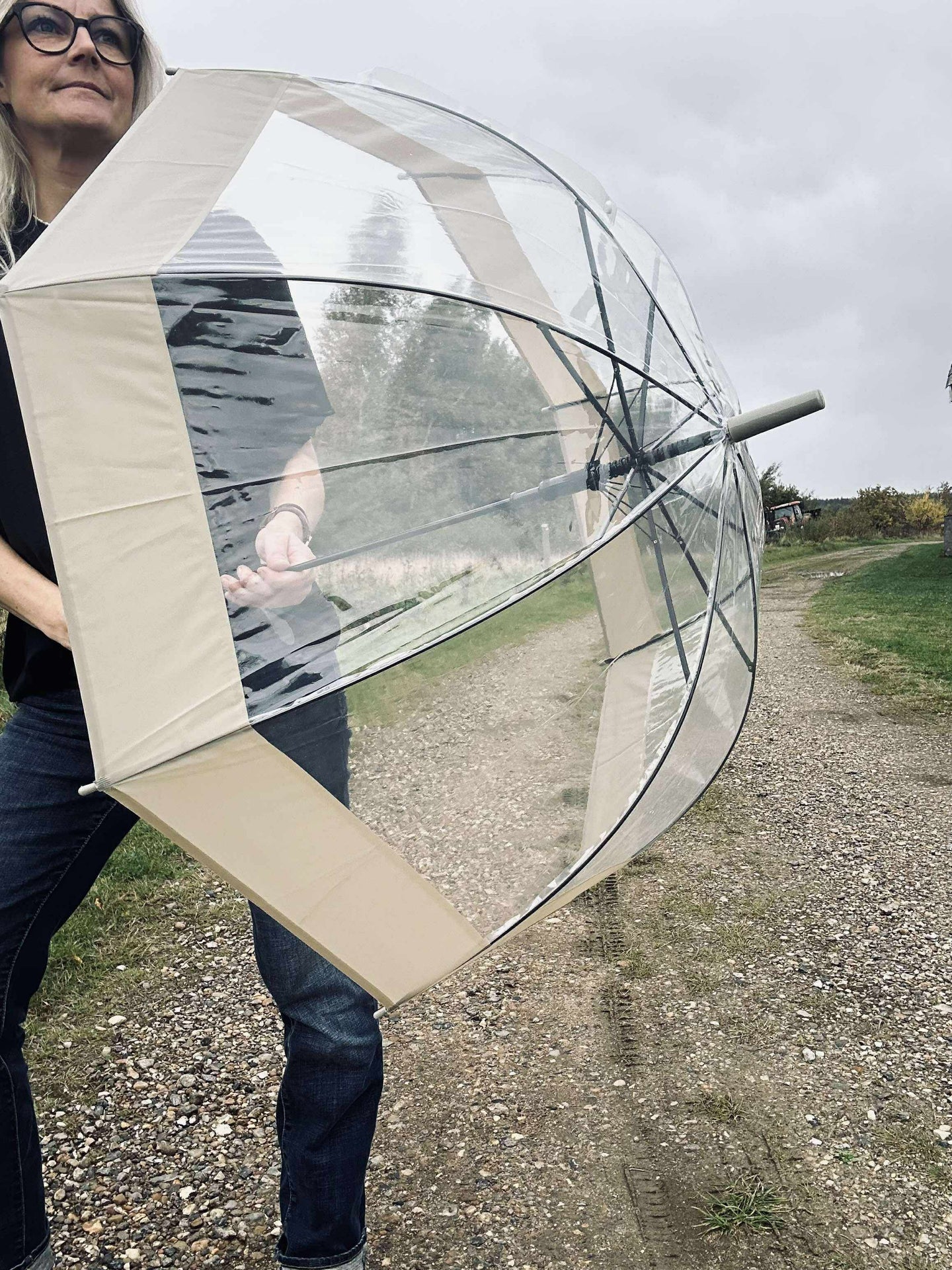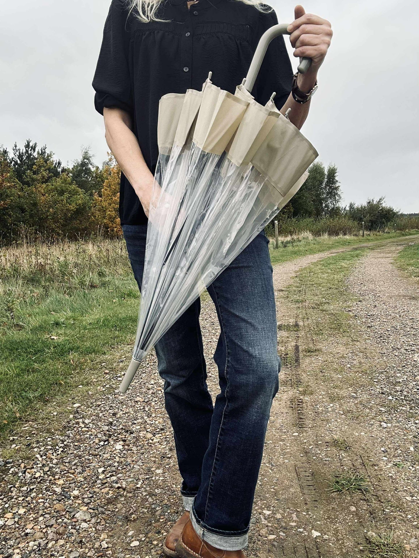 Detta paraply erbjuder en särskild kombination av stil och funktionalitet. Den genomskinliga designen gör att du kan njuta av omgivningen även under regniga dagar, medan den beige kanten ger en subtil touch av färg. Dessutom ger den genomskinliga ytan en känsla av rymd och öppenhet, vilket kan göra promenader i regnet till en mer behaglig upplevelse.