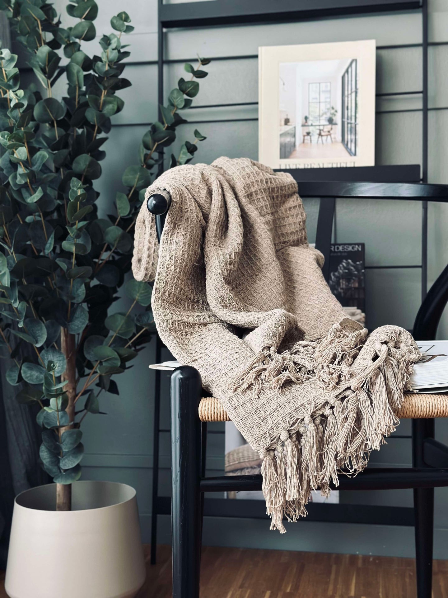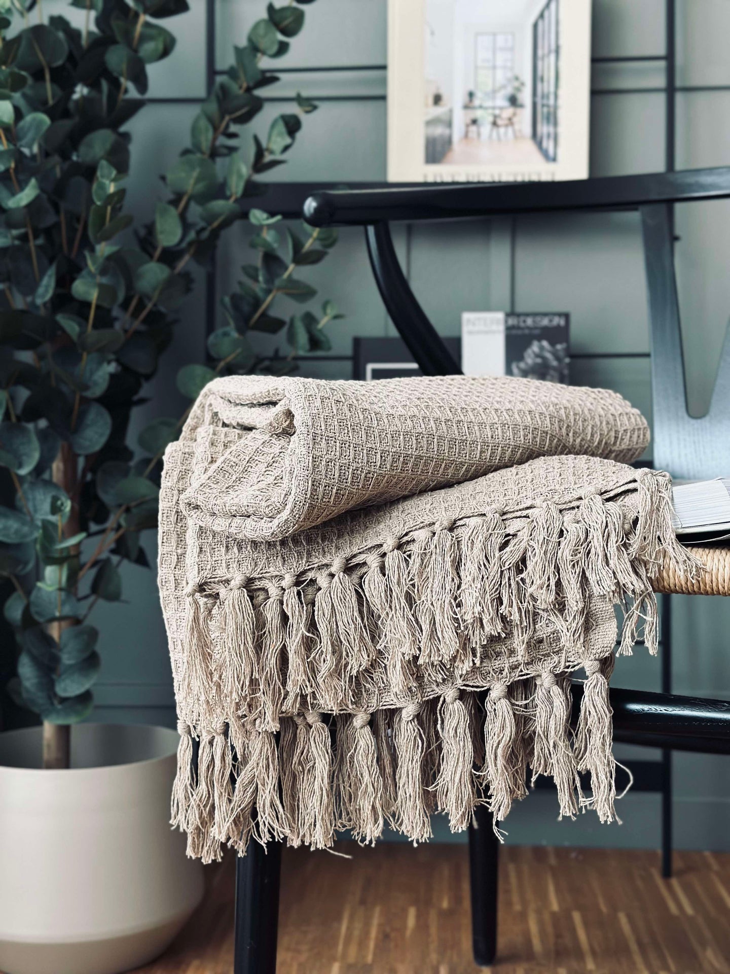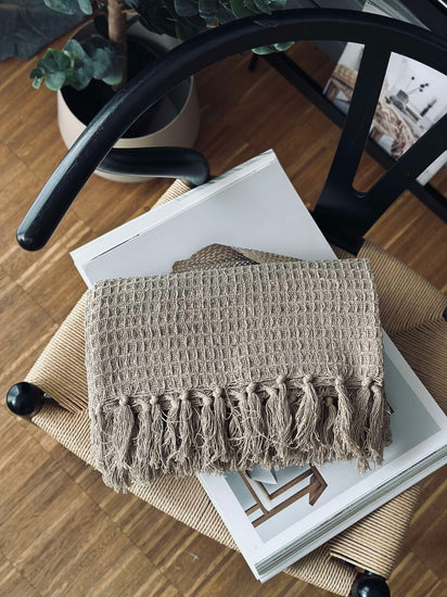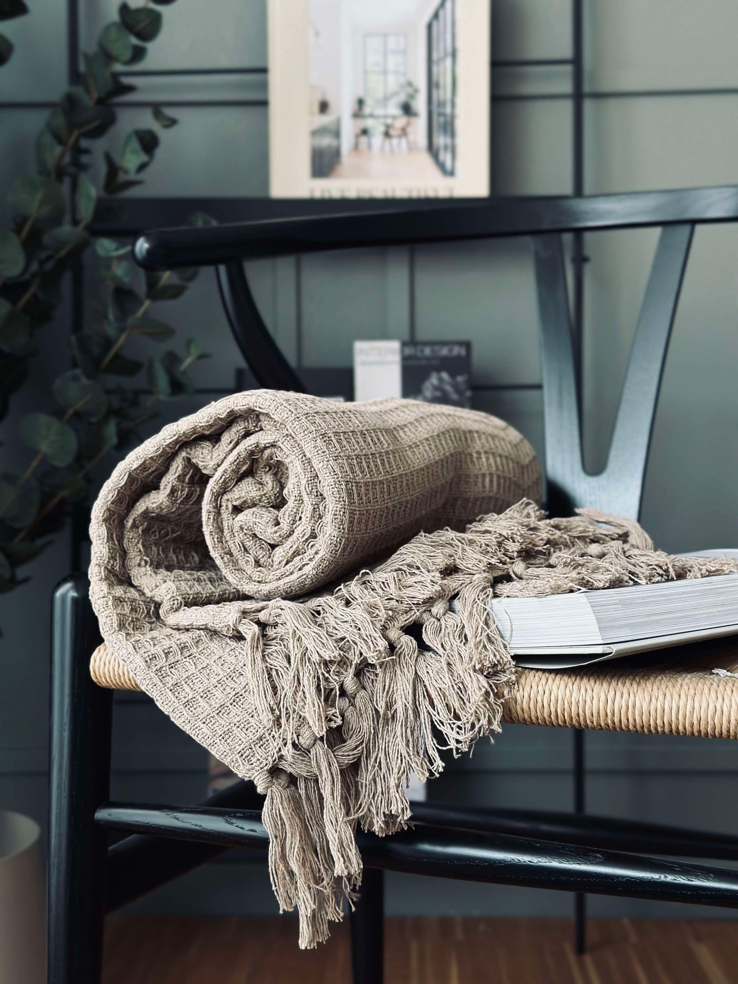 Trött på att frysa om kvällarna? Våfflad bomullsfilt i beige ger värme och komfort med en miljövänlig touch. Utmärkt för svala stunder i soffan eller som ett extra lager i sängen. En hållbar och stilren lösning för alla inredningsbehov.