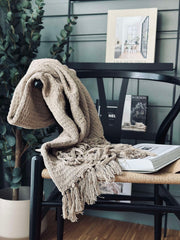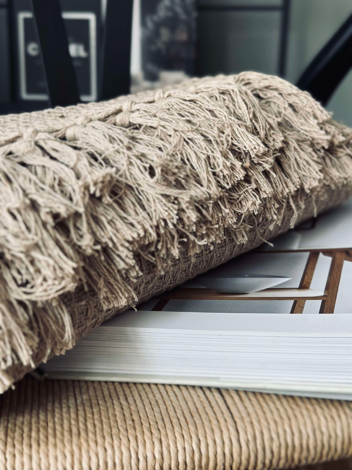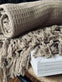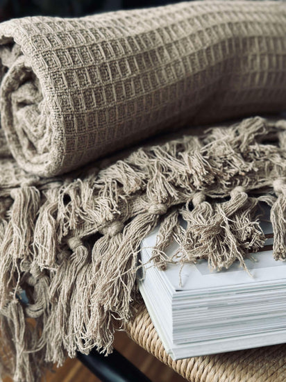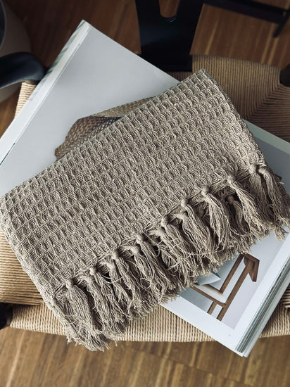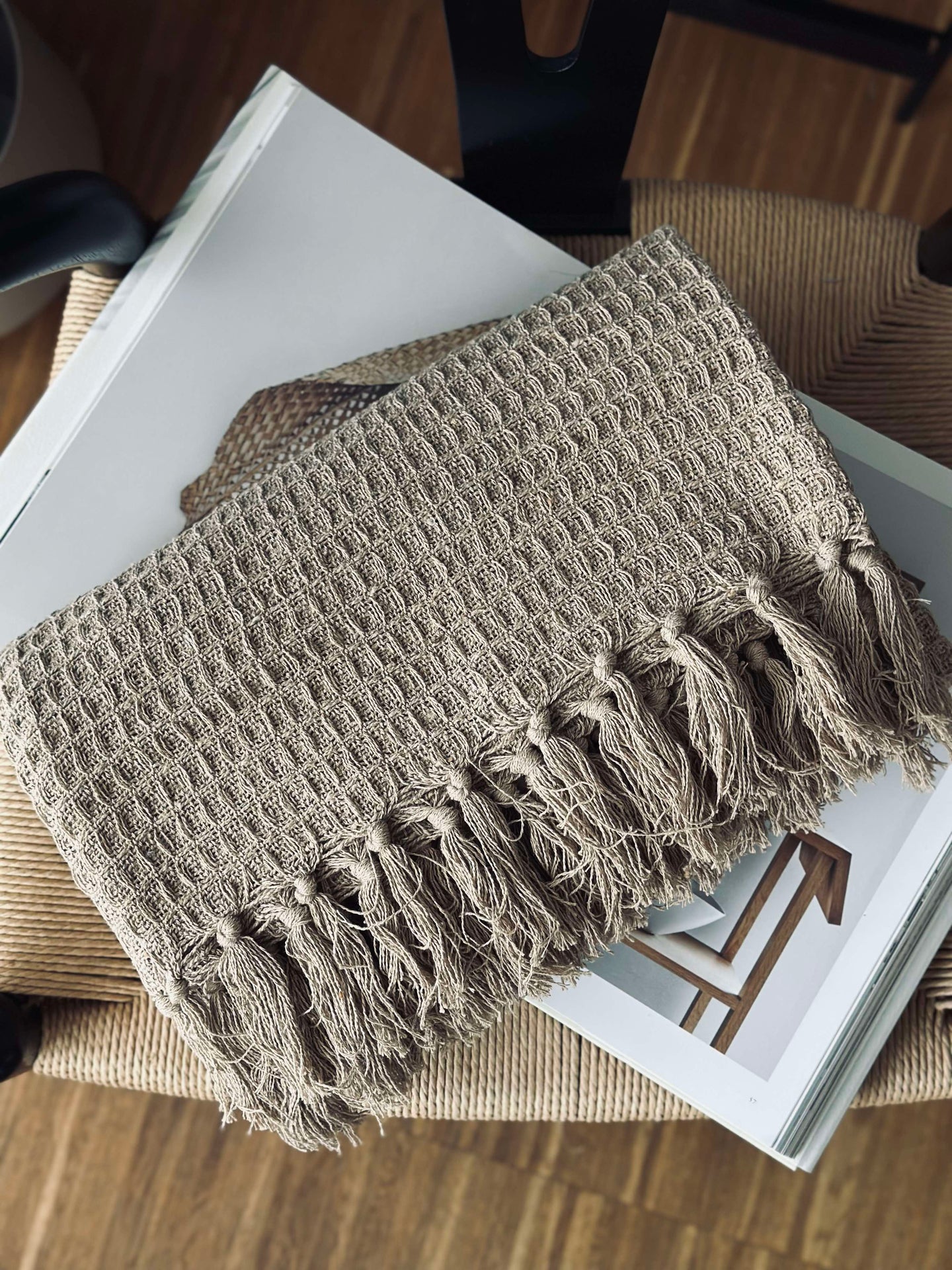 Trött på att frysa om kvällarna? Våfflad bomullsfilt i beige ger värme och komfort med en miljövänlig touch. Utmärkt för svala stunder i soffan eller som ett extra lager i sängen. En hållbar och stilren lösning för alla inredningsbehov.