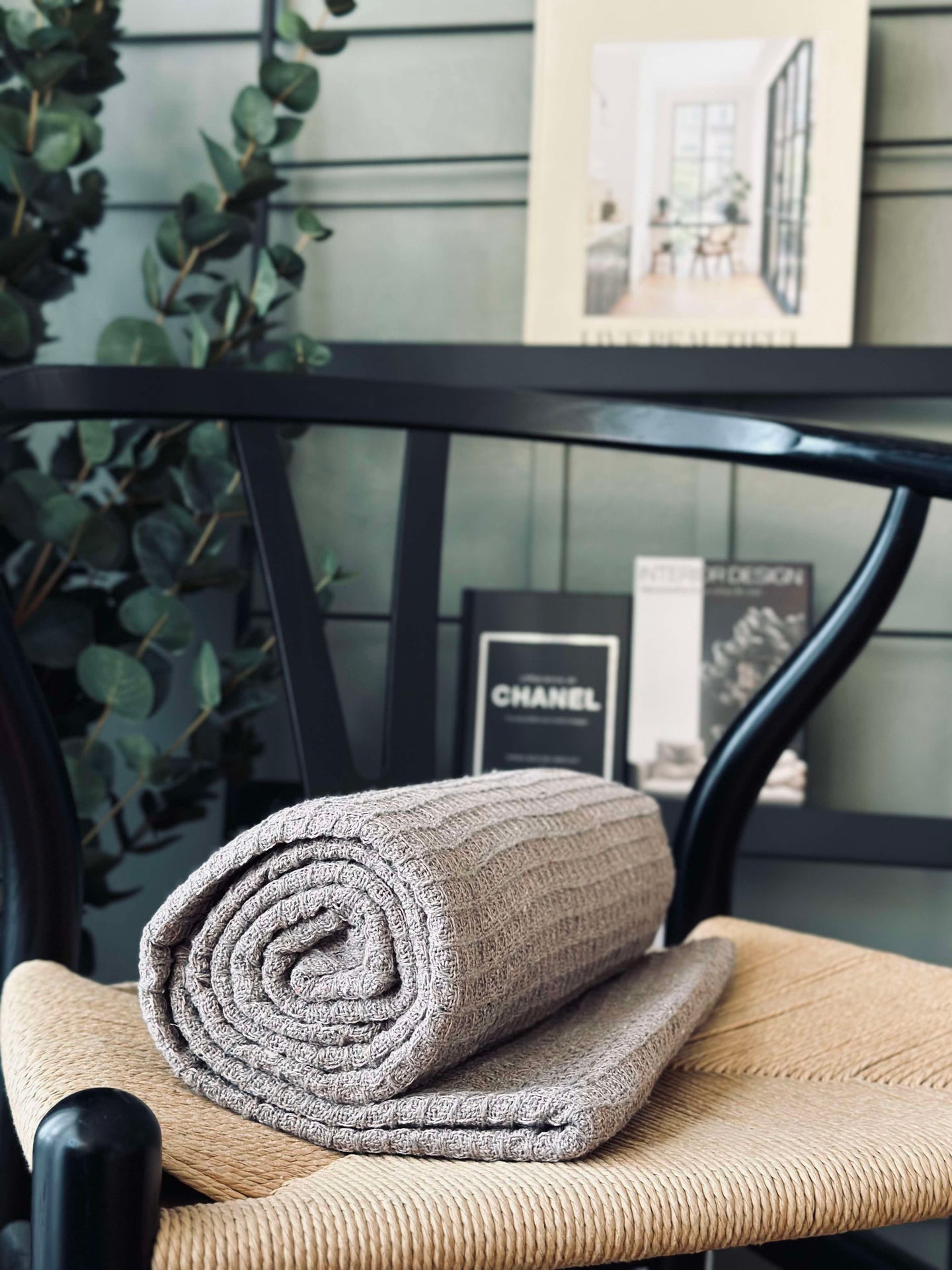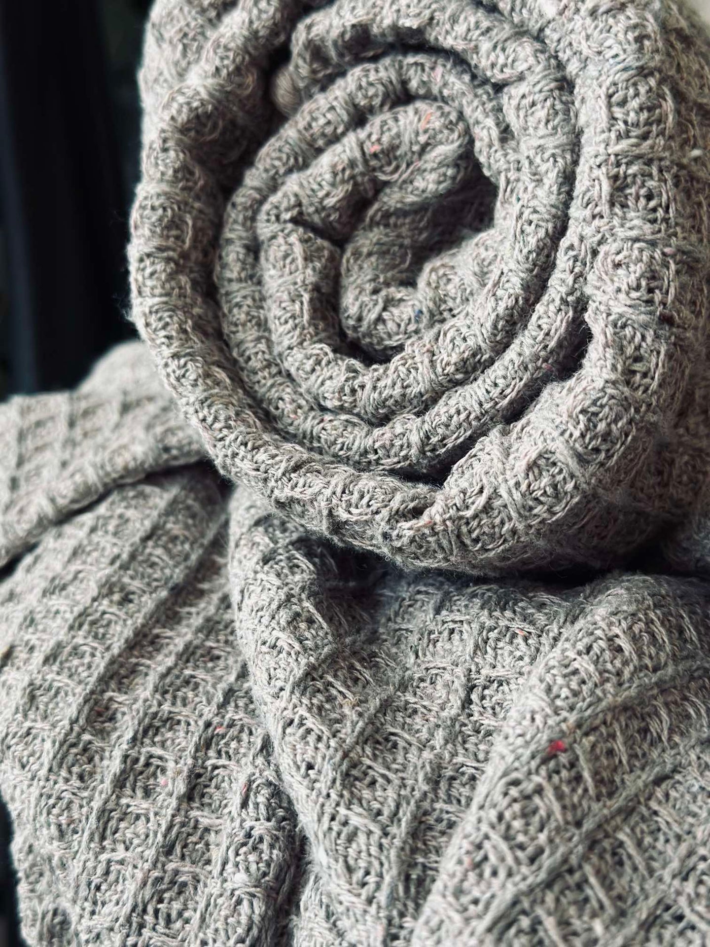 Bomullspläden är tillverkad av äkta återvunnen bomull, vilket bidrar till en hållbar livsstil genom att minska avfall och resursslöseri. Den våfflade strukturen ger en mjuk och luftig känsla, vilket gör pläden behaglig att använda året runt. Den särpräglade texturen skapar dessutom en intressant visuell dimension som enkelt kompletterar olika inredningsstilar.