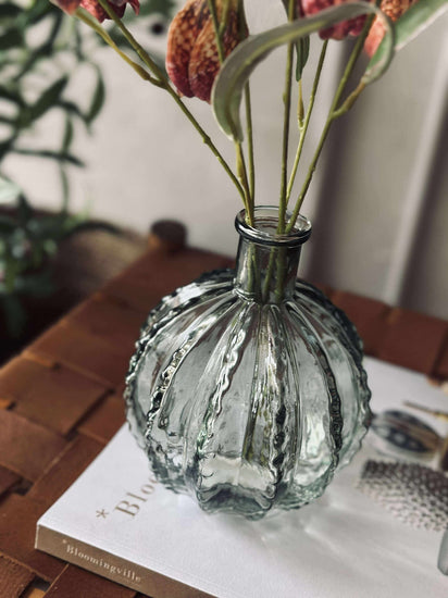 Den gröna glasvasen är tillverkad av glas, vilket ger den en transparent och ren yta som låter ljuset spela fritt genom materialet. Detta skapar en naturlig och behaglig atmosfär i rummet. Glasets hållbarhet och tidlöshet gör det till ett långvarigt val, samtidigt som det ger en känsla av lätthet och elegans till inredningen.