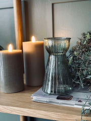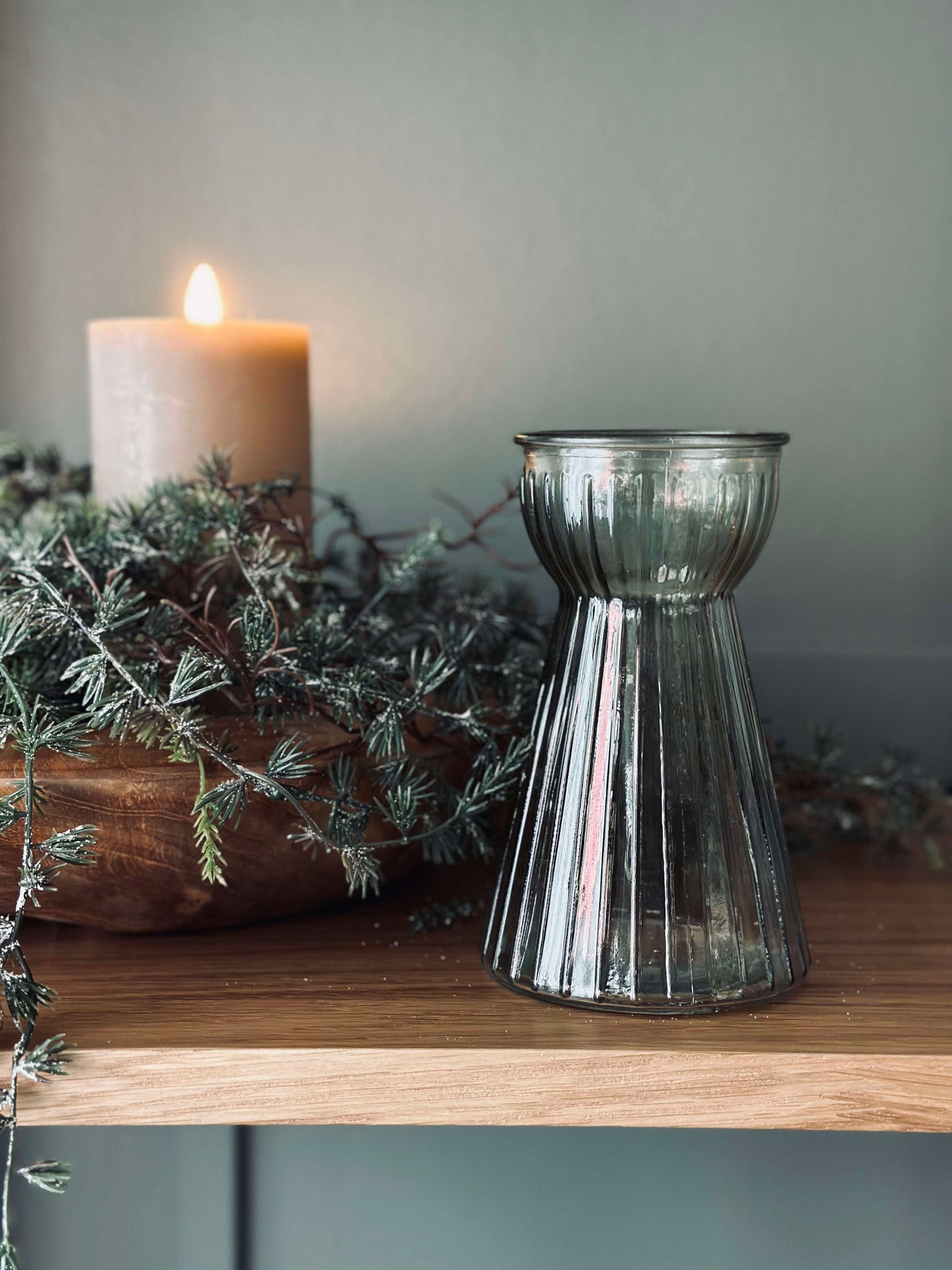 Den gröna vasen är tillverkad av glas, vilket ger den en tidlös och stilren känsla. Glasets transparens och glans bidrar till att framhäva blommornas naturliga skönhet och färger. Dessutom är glas ett hållbart och lättskött material, vilket gör det enkelt att rengöra och underhålla vasen över tid.