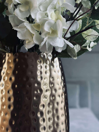 Metallvasen har en gyllene färg och en yta med struktur, som tillför djup och spel till inredningen.