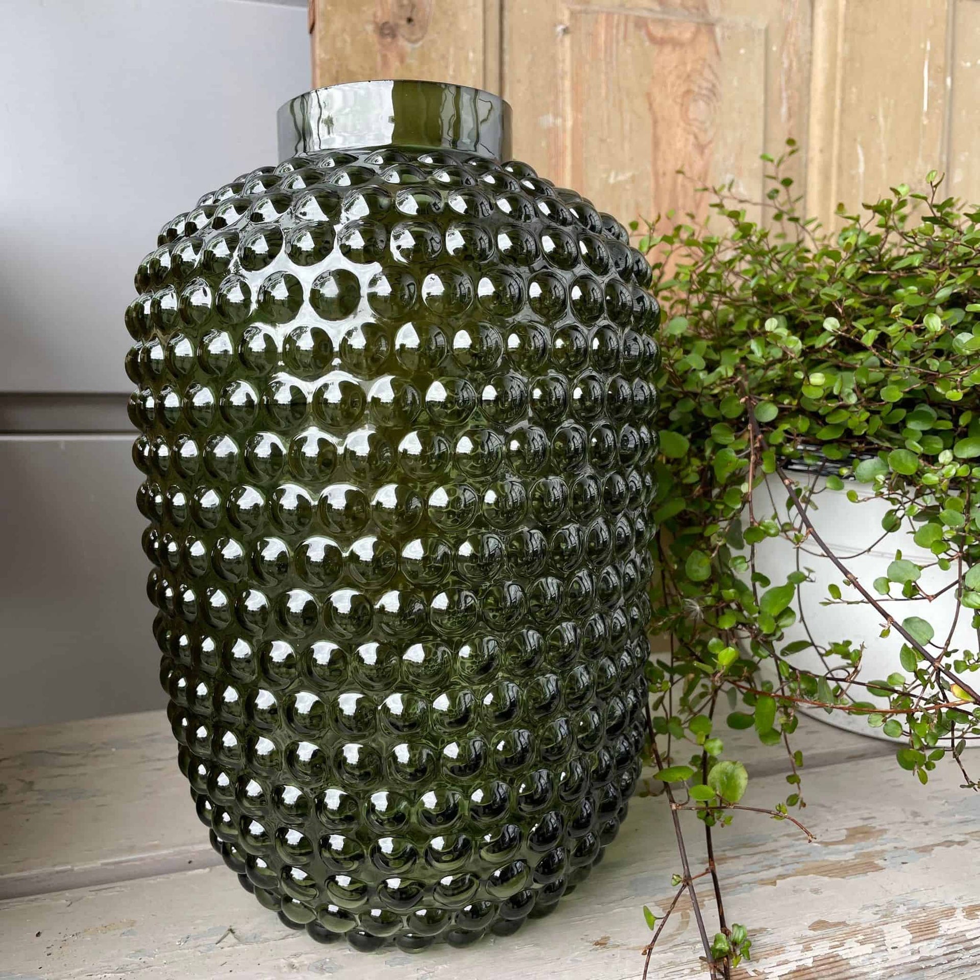 En underbart vacker prickig vas i flaskgrön färg. Den bubblande texturen och den glänsande ytan gör denna vas till ett modernt och organiskt tillägg till ditt hem.