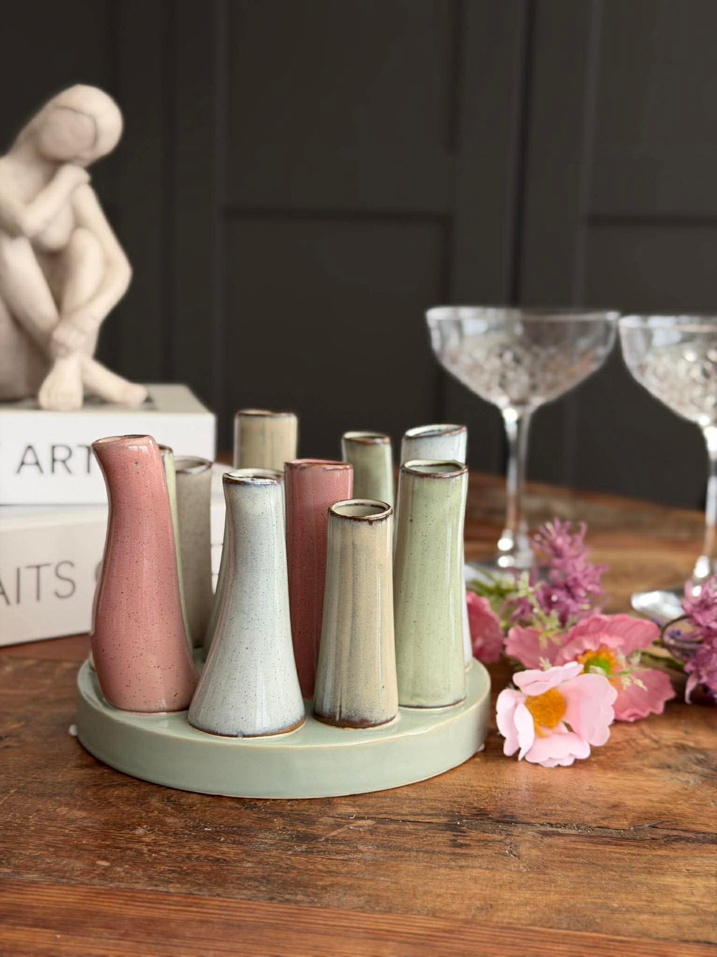 Den runda siluetten fungerar både ensam som prydnadsföremål och som en liten vas för en enkel styling. Använd den på en skänk, en hylla eller som en del av ett stilleben, där formen får skapa fokus.
