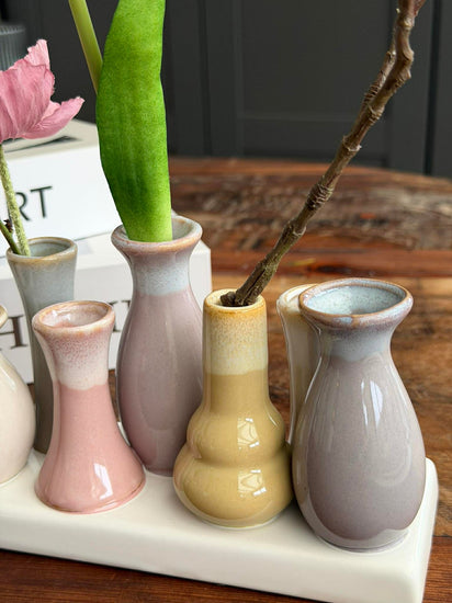 Vase Siluetta är en dekorativ vas för små blomstjälkar. Den är tillverkad i keramik och har ett lugnt uttryck i dämpade färger, vilket gör den lätt att kombinera med resten av din inredning.