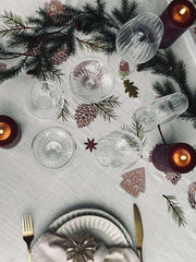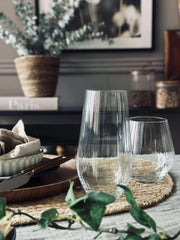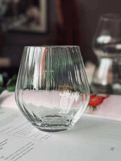 Vattenglaset är tillverkat av klart glas, vilket ger en tydlig visuell upplevelse och gör det enkelt att se innehållet. Den klara designen passar sömlöst in i olika köksstilar och bordsdukningar. Glasets transparens bidrar också till en känsla av renhet och fräschhet, vilket gör det till ett praktiskt val för daglig användning och speciella tillfällen.