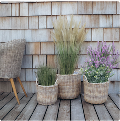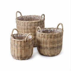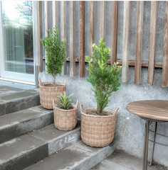 Plantkorgarna är tillverkade av naturlig poly-rattan, vilket ger dem en naturlig skönhet samtidigt som de är hållbara och väderbeständiga. Materialet är lätt att rengöra och motståndskraftigt mot fukt, vilket gör dessa korgar lämpliga för både inomhus- och utomhusbruk. Den naturliga poly-rattans flexibilitet och styrka säkerställer en långvarig användning, vilket bidrar till en hållbar livsstil.
