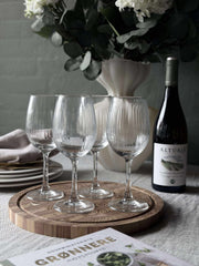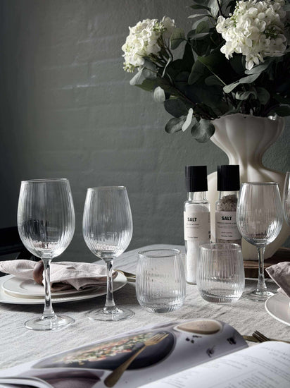 Vinglasen är tillverkade av klart glas med äkta guldkant, vilket ger en subtil och sofistikerad touch till din dukning. Den klara glaskonstruktionen låter vinets färg och karaktär framträda tydligt, medan guldkanten tillför en känsla av lyx. Detta gör dem lämpliga för både vardagliga måltider och mer formella tillställningar, där de bidrar till en stilren och inbjudande atmosfär.