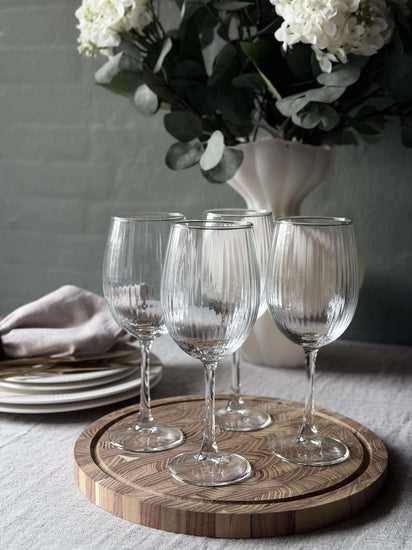 Dessa rödvinsglas är tillverkade av klart glas, vilket ger en tydlig och ren presentation av vinet. Den räfflade strukturen på glaset skapar en intressant visuell effekt och ger ett bekvämt grepp. Guldkanten tillför en subtil lyxig detalj som kan förhöja upplevelsen vid varje tillfälle. Kombinationen av dessa element gör glasen både funktionella och stiliga i varje kök.