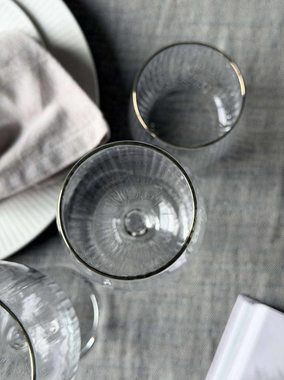- Rödvinsglasen är tillverkade av klart glas med rillad struktur och guldkant