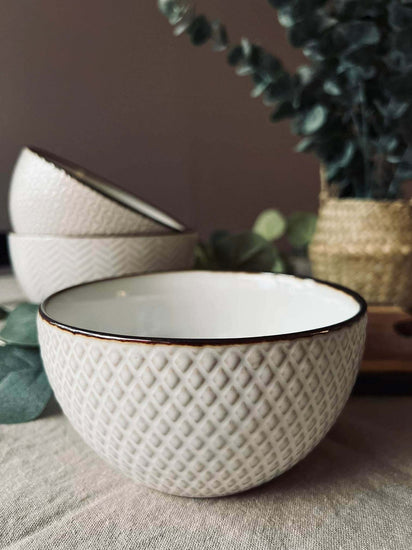 Förbättra din matupplevelse med dessa vita porslinsskålar med gulddetaljer. De är perfekta för att servera snacks eller frukost, och lägger till en touch av lyx till ditt kök. Upplev kvalitet och stil i varje bit du serverar.
