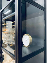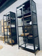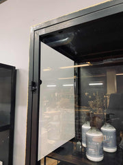 Öka din inredningsstil med detta sofistikerade vitrinskåp. Bjud in en känsla av genomsynlighet och rymd till ditt vardagsrum. Dess unika svarta design med guldkanter och robusta metallhyllor ger både funktionalitet och en distinkt estetik. Observera, detta är en utställningsmodell.