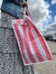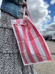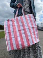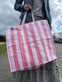 Vi introducerar vår XL strandväska med röda och vita ränder. Denna väska är inte bara tilltalande att titta på, utan den är också extremt praktisk. Med dess JUMBO-storlek finns det inga gränser för vad du kan ta med dig. Oavsett om du behöver packa en picknick, en bok att läsa eller till och med en filt, så har vår XL strandväska dig täckt.