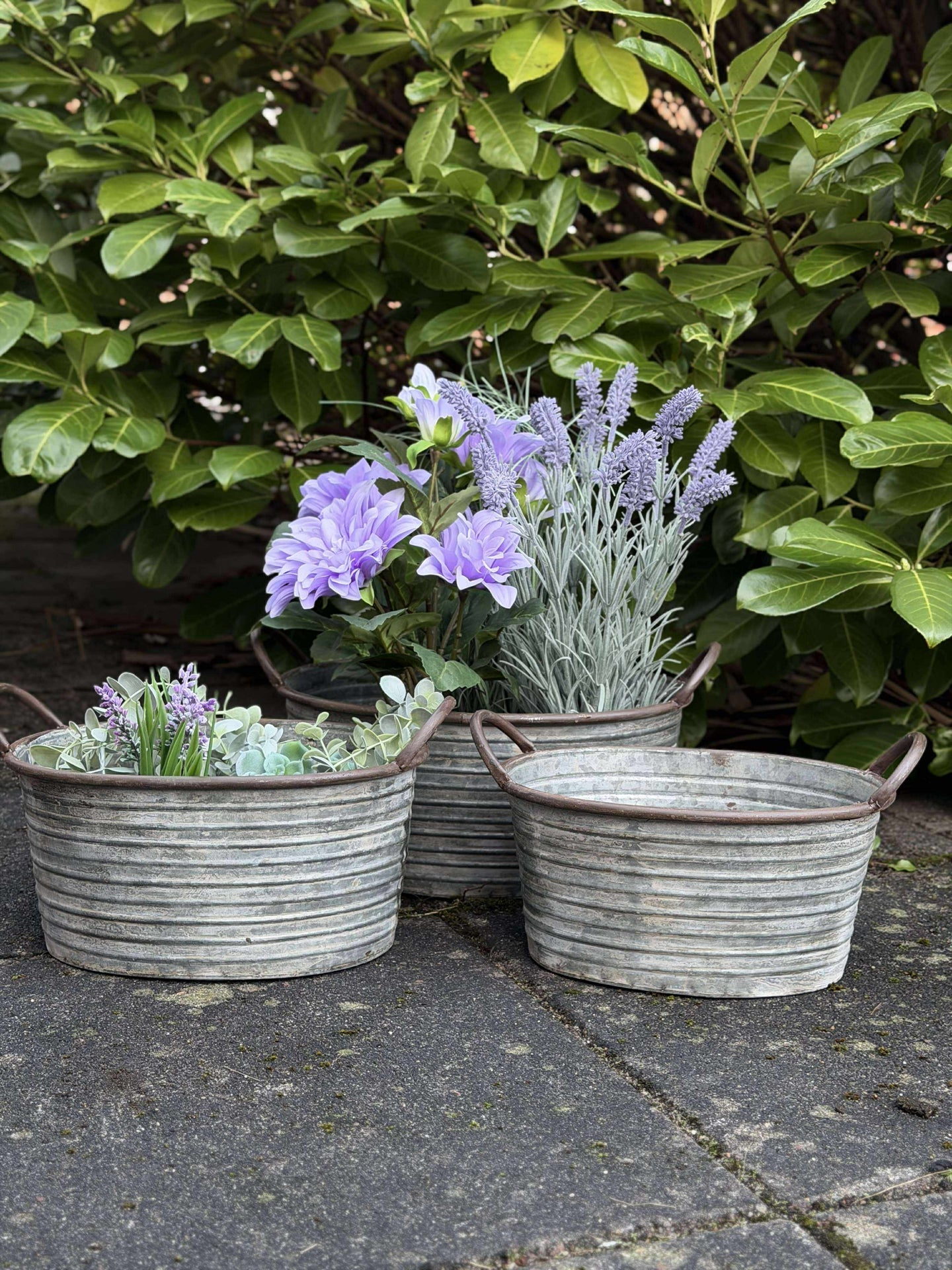 - Setet innehåller tre zinkbaljor med rustik finish